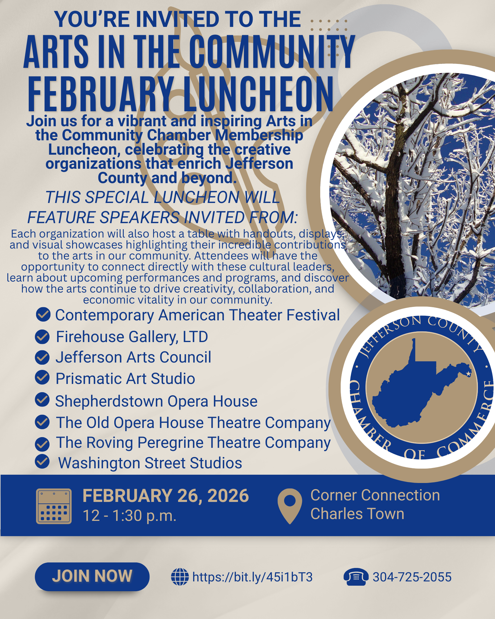 Join us for a vibrant and inspiring Arts in the Community Chamber Membership Luncheon, celebrating the creative organizations that enrich Jefferson County and beyond. This special luncheon will feature speakers invited from: