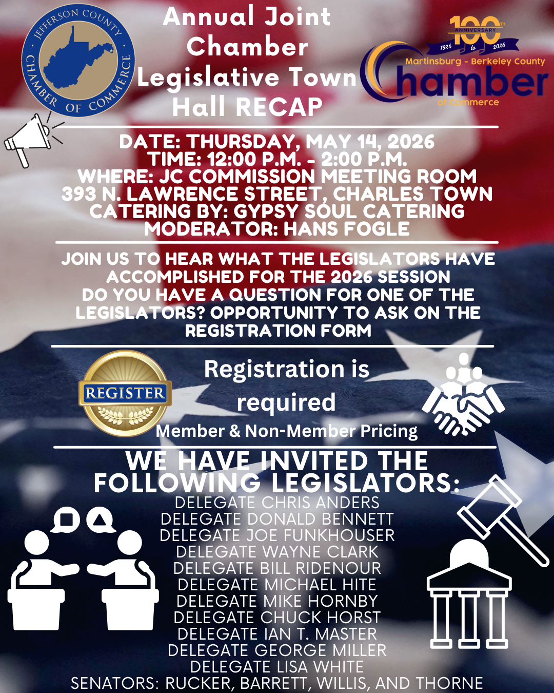 Join members of the Jefferson County Chamber of Commerce and the Martinsburg–Berkeley County Chamber of Commerce for our Annual Legislative Recap, where regional business leaders come together to hear directly from our elected officials about the outcomes of the most recent legislative session.