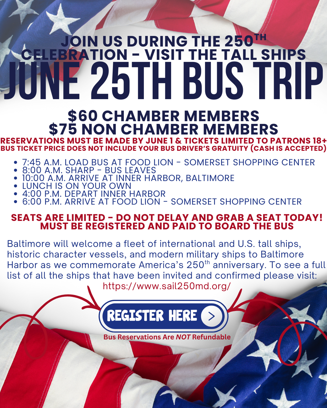 Step back in time and celebrate America’s 250th birthday with us! Join fellow Chamber members for a memorable visit to the majestic Tall Ships in the Inner Harbor of Baltimore. This special celebration offers a rare chance to experience these historic vessels up close while enjoying networking, history, and the vibrant waterfront atmosphere. Don’t miss this unique opportunity to commemorate our nation’s milestone together!