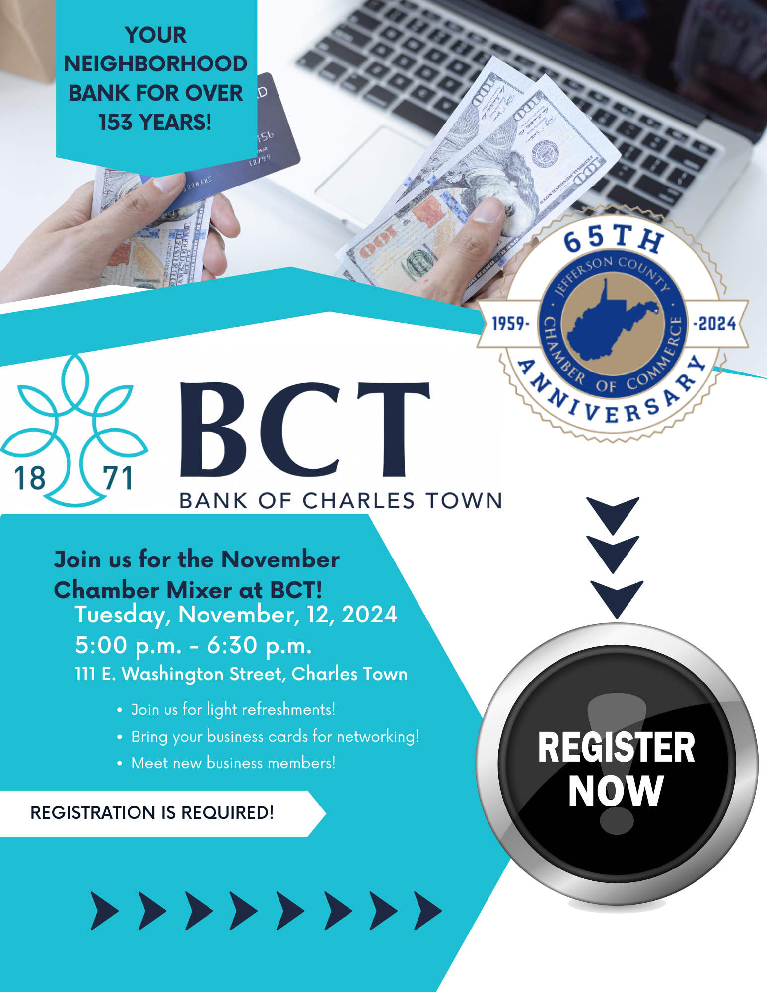 Join us for the November Monthly Chamber Mixer, hosted by BCT-Bank of Charles Town! Great Networking event so bring your business cards! This event is FREE for members; however, registration is required and open to everyone!Images
