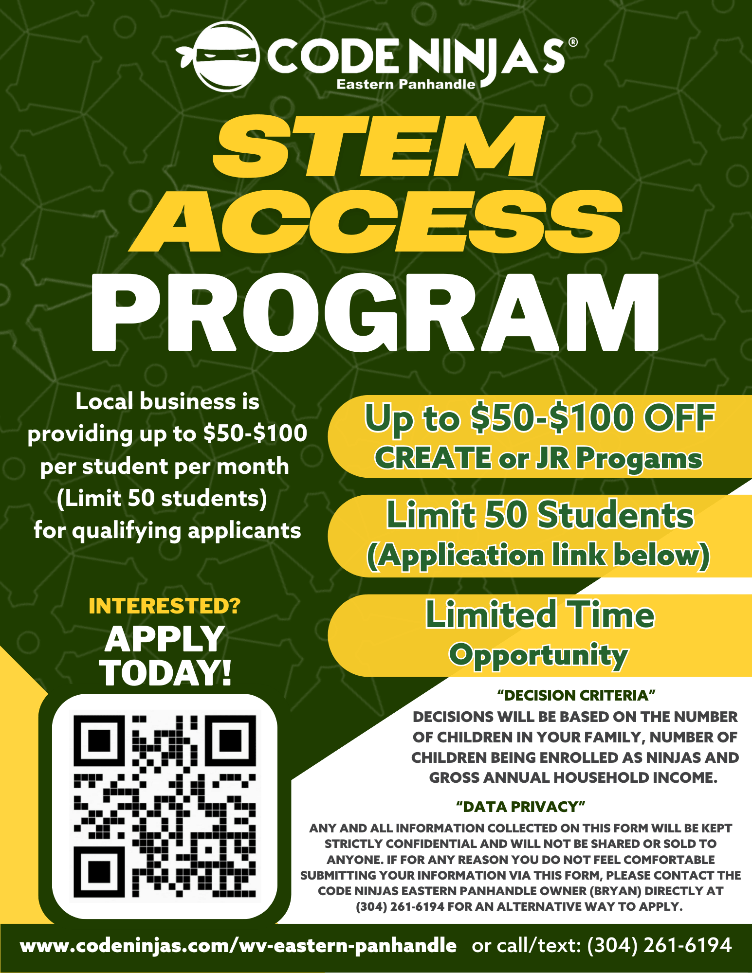 Locally Owned and Operated. Code Ninjas Eastern Panhandle is the first Code Ninjas franchise in the state of West Virginia. We are part of a global network of close to 400 franchises where we provide a proven high quality computer coding program for children ages of 5+. Our students learn in a fun and engaging environment while also being able to collaborate internally with other Code Ninja students from around the world. Sign up today to become part of our growing Code Ninja family.