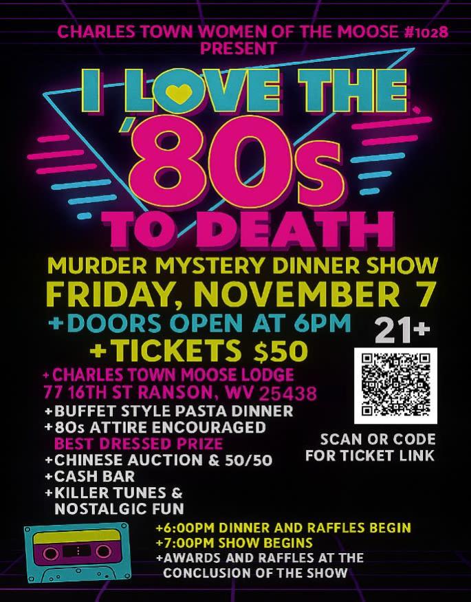 Welcome to I Love the 80’s to Death! 🎶🔪✨ Get ready for a totally tubular night of mystery at the Rockin’ Radical Night happening at the Charles Town Moose Lodge! Break out your leg warmers, acid wash jeans, and tease that big hair—because this gnarly evening is going to be all that and a bag of chips! Step back into the raddest decade ever as we solve a murder straight out of the 80’s. The big names are here for a mega concert, but when backstage secrets spill into the spotlight, the night takes a tragic (and totally dramatic) turn. This isn’t Miami Vice—this is like… murder! And it’s up to YOU to crack the case. Bust it like a ghost, peg those jeans, slouch those socks, and get that neon glowing—it’s time to solve the crime in style. No time to be Too Shy! You’re a Smooth Operator who knows to listen to those Careless Whispers. So put on your Sunglasses at Night and Relax—because time after time, you’ll get closer to the truth. 🎤 What’s Included: 🍝 Murder Mystery Dinner Show featuring a buffet-style pasta dinner 👗 80’s attire encouraged (prizes for the most radical look!) 🎟️ Chinese Auction & 50/50 🍸 Cash Bar 🎶 Killer tunes & nostalgic fun 🕕 Event Schedule: Doors Open: 6:00 PM Dinner & Raffles Begin: 6:00 PM Show Starts: 7:00 PM Raffle Winners & Best Dressed Prizes: Announced at the conclusion of the show All proceeds benefit the Charles Town Women of the Moose #1028—a sisterhood dedicated to community, friendship, and support. Don’t miss this bodacious evening of fun, food, and mystery!