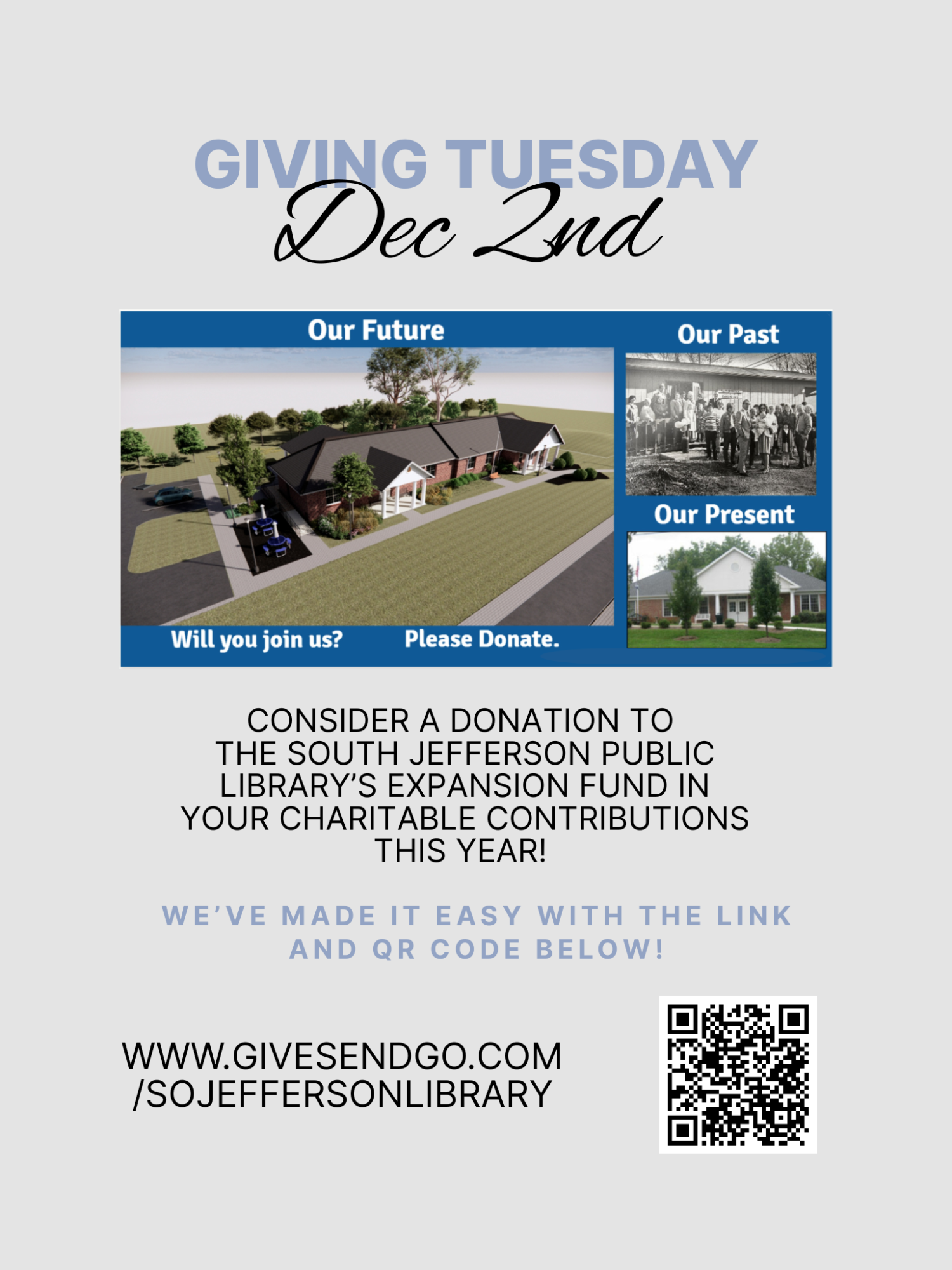 The South Jefferson Public Library is launching their new GiveSendGo fundraising campaign just in time for Giving Tuesday! Please help us spread the word about our Expansion Project and visit our new donation website,